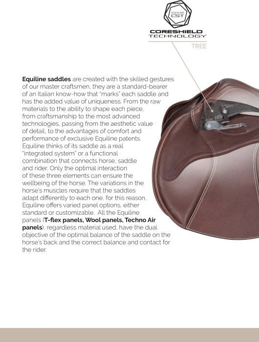 Designed for a more open hip angle with a longer leg, the American Hunter features a narrow twist with a slightly wider seat. The saddle boasts a molded, padded flap with T-foam, along with removable knee and thigh blocks, bottom flap leather reinforcement, and Equiline’s stirrup bar locking system. The Stirrup bar is fixed 2 cm backward compared with other saddles. Includes an embossed Equiline logo for a classical look.Â