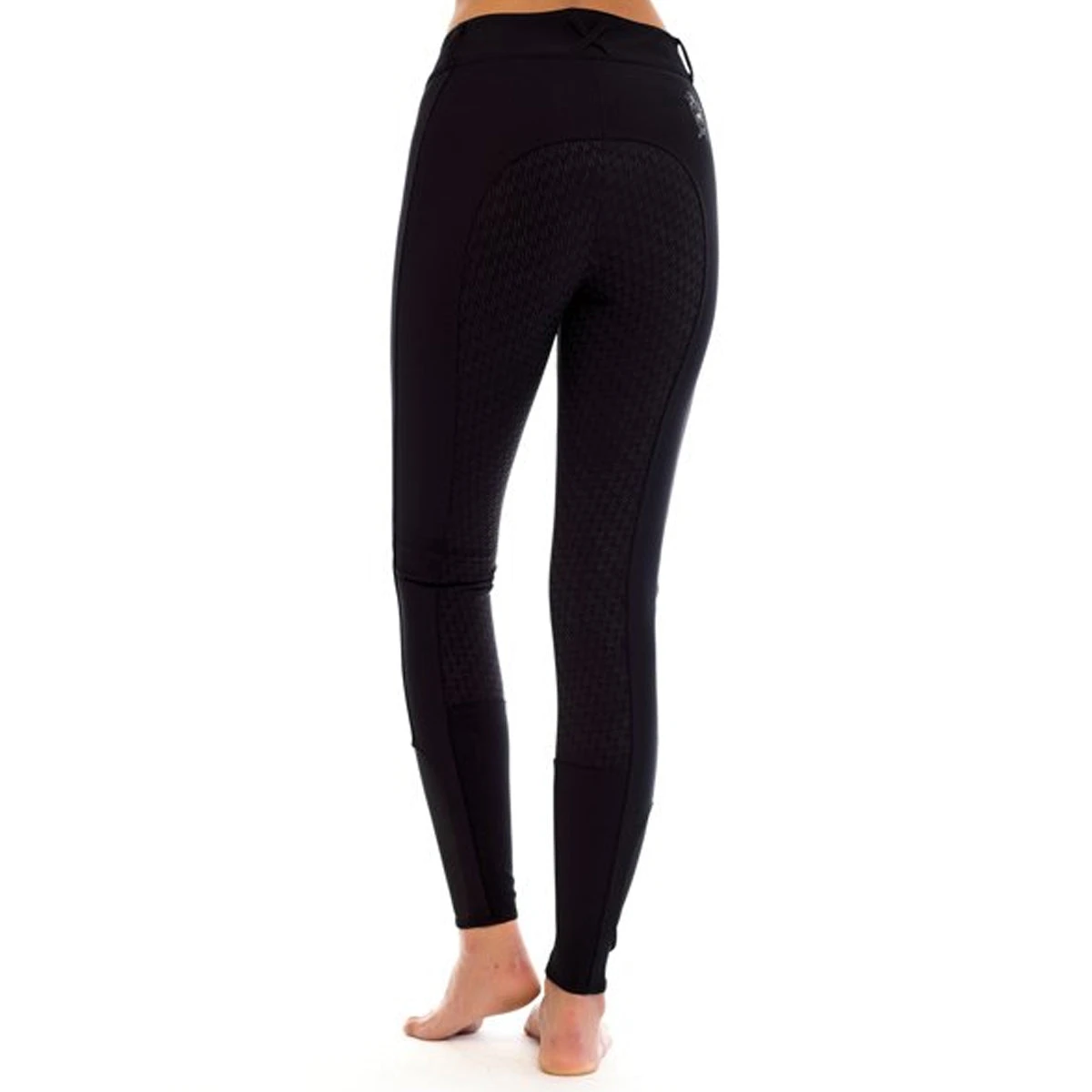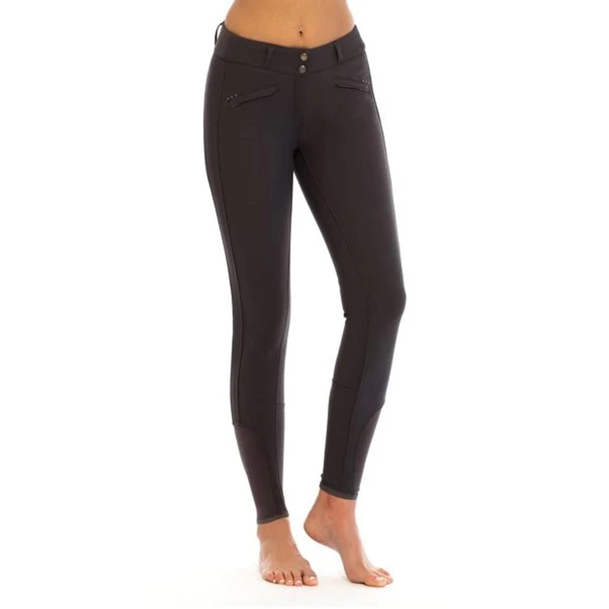 This breech is truly a Miracle breech in a fabric with 24% spandex for incredible stretch, support and recovery. In a flattering mid rise fit. Back comes up higher for a secure and perfect feel. Beautiful seaming on side of leg for a flattering look. Welt zip pockets in front with tiny crystals at edge of pocket and Silver reflective silicone piping. Sock style bottom for a snug fit under your boots. Back has a cross beltloop. Final touch is an embroidered logo with subtle crystal embellishment. This is our new absolute favorite breech!